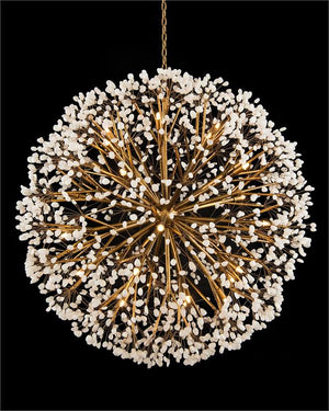 A luminous spherical chandelier with thirty lights, finished in rich gold leaf. An explosion of natural quartz crystals radiates from the center, creating a dazzling starburst effect that transforms any space into a statement of luxury.