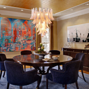 The lamp is composed of 52 large, hand-blown glass pendant petals in pink and white glass, creating an enchanting contrast and adding a touch of glamor to any room. The abstract shapes on the glasses add a subtle artistic dimension to the chandelier that catches the eye and creates a beautiful light.