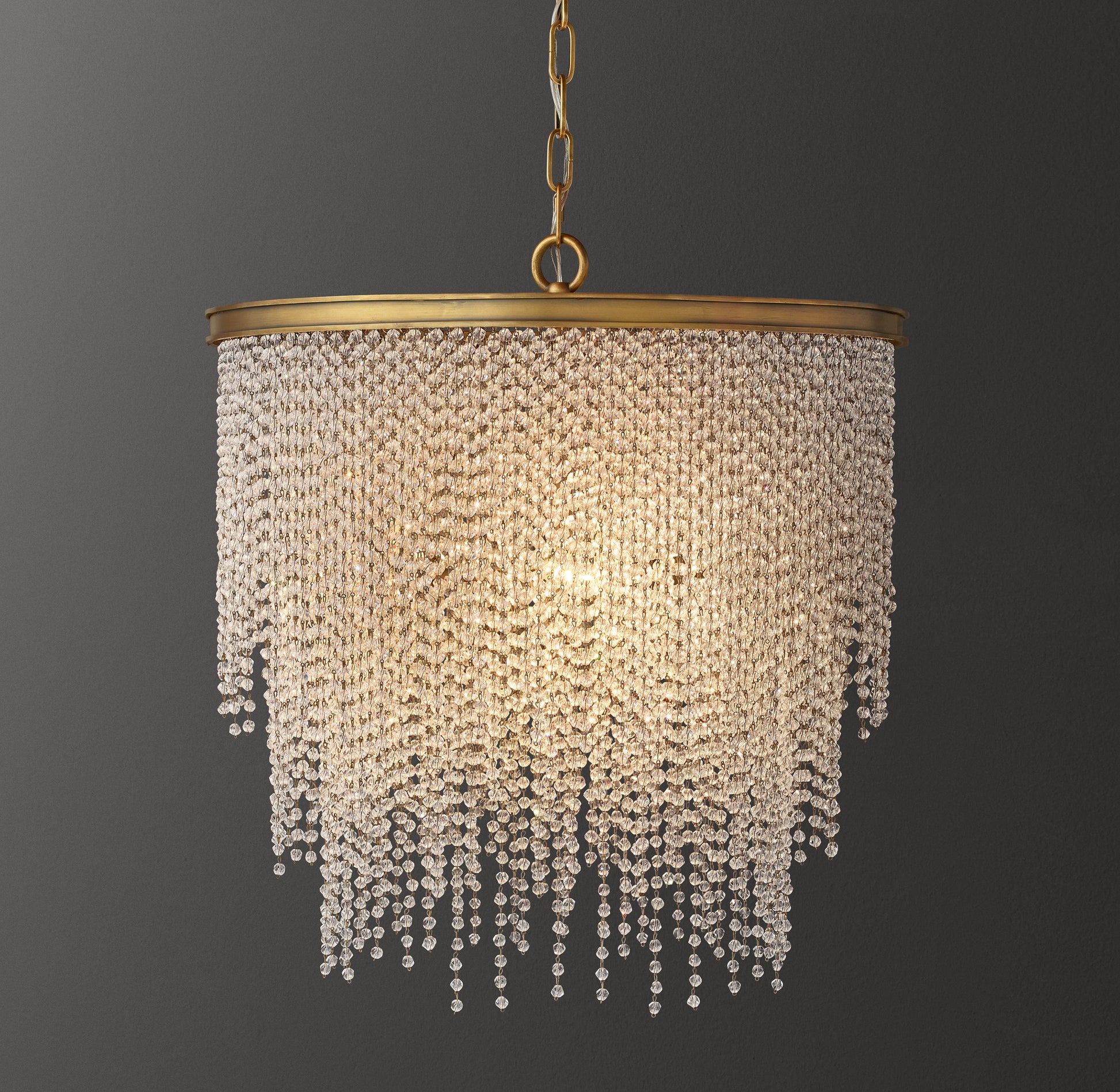 - Strands of clear crystal beads at varying lengths suspend from a circular metal frame