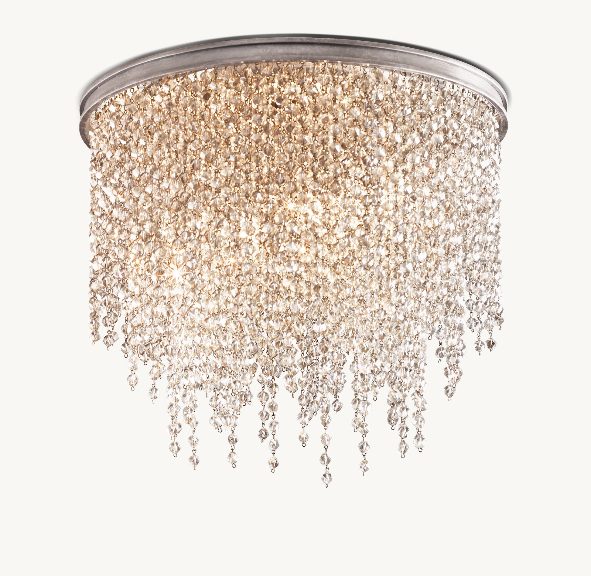 - Strands of crystal beads at varying lengths hang from a circular metal frame
