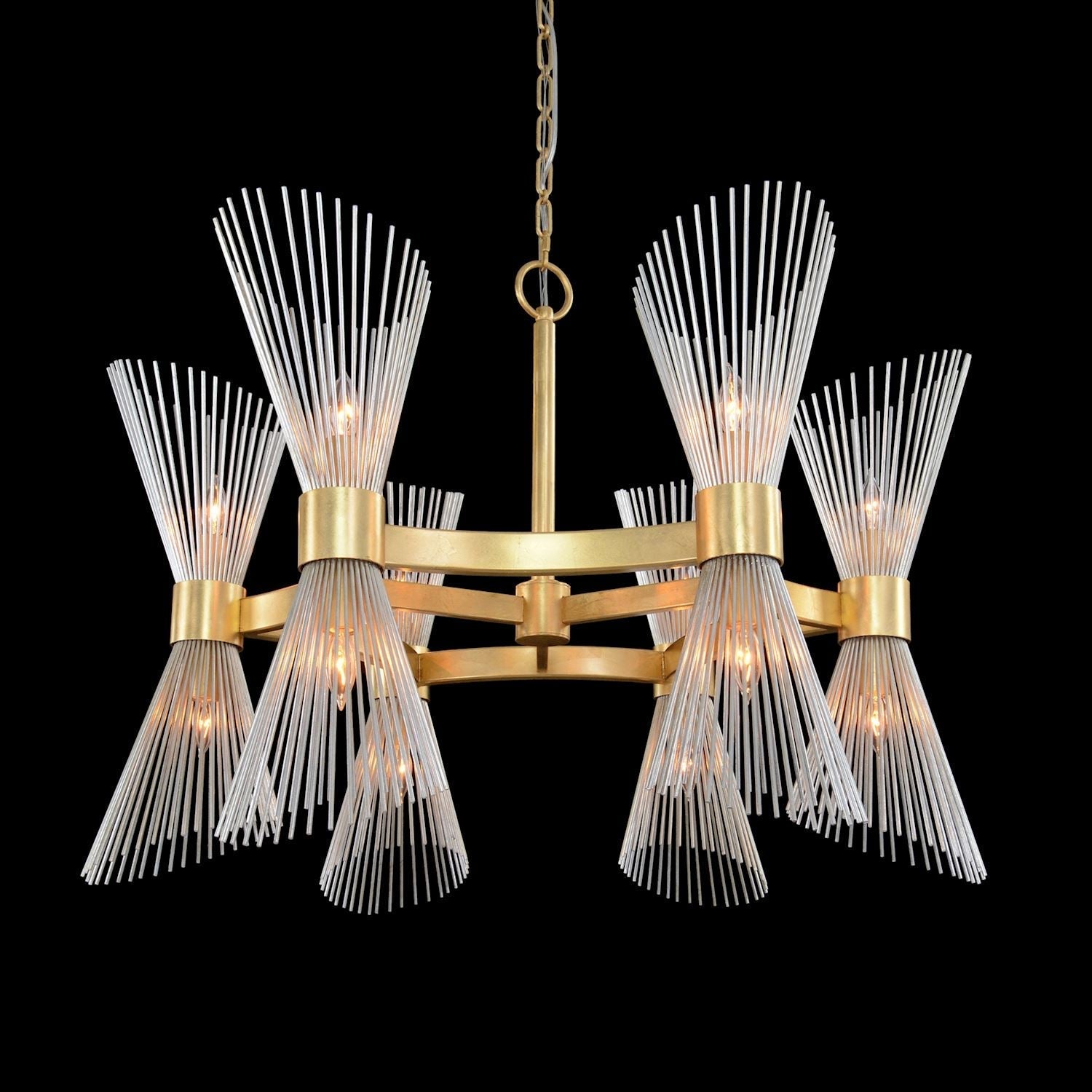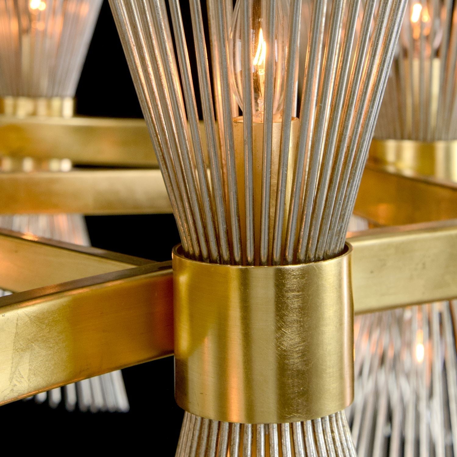 The Bonheur Twelve-Light Horizontal Chandelier is a charismatic design featuring staggered slant-cut rod shades in silver leaf, forming a graceful conical silhouette. The metallic frame in opulent gold leaf provides a striking contrast, adding depth and visual intrigue. With its adjustable dimmer, Bonheur offers both elegance and versatility, making it a timeless fit for contemporary interiors.