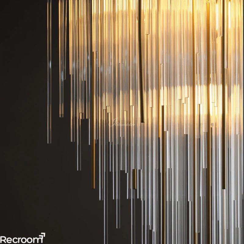 In the Casa collection, crystal and metal rods and coexist as hundreds of slender tubes are hung asymmetrically from a smooth canopy, refracting dramatically and artfully evoking rainfall frozen in time
