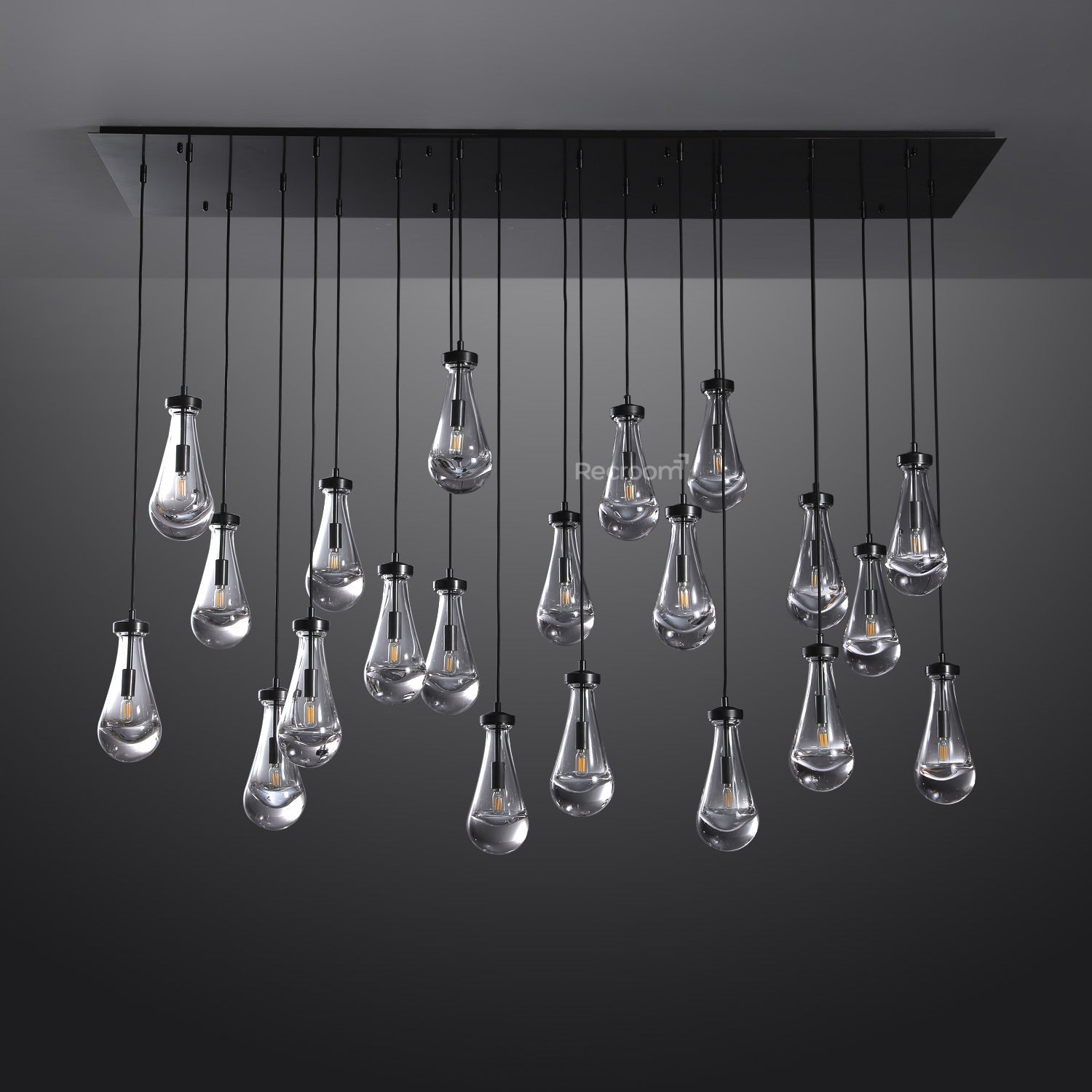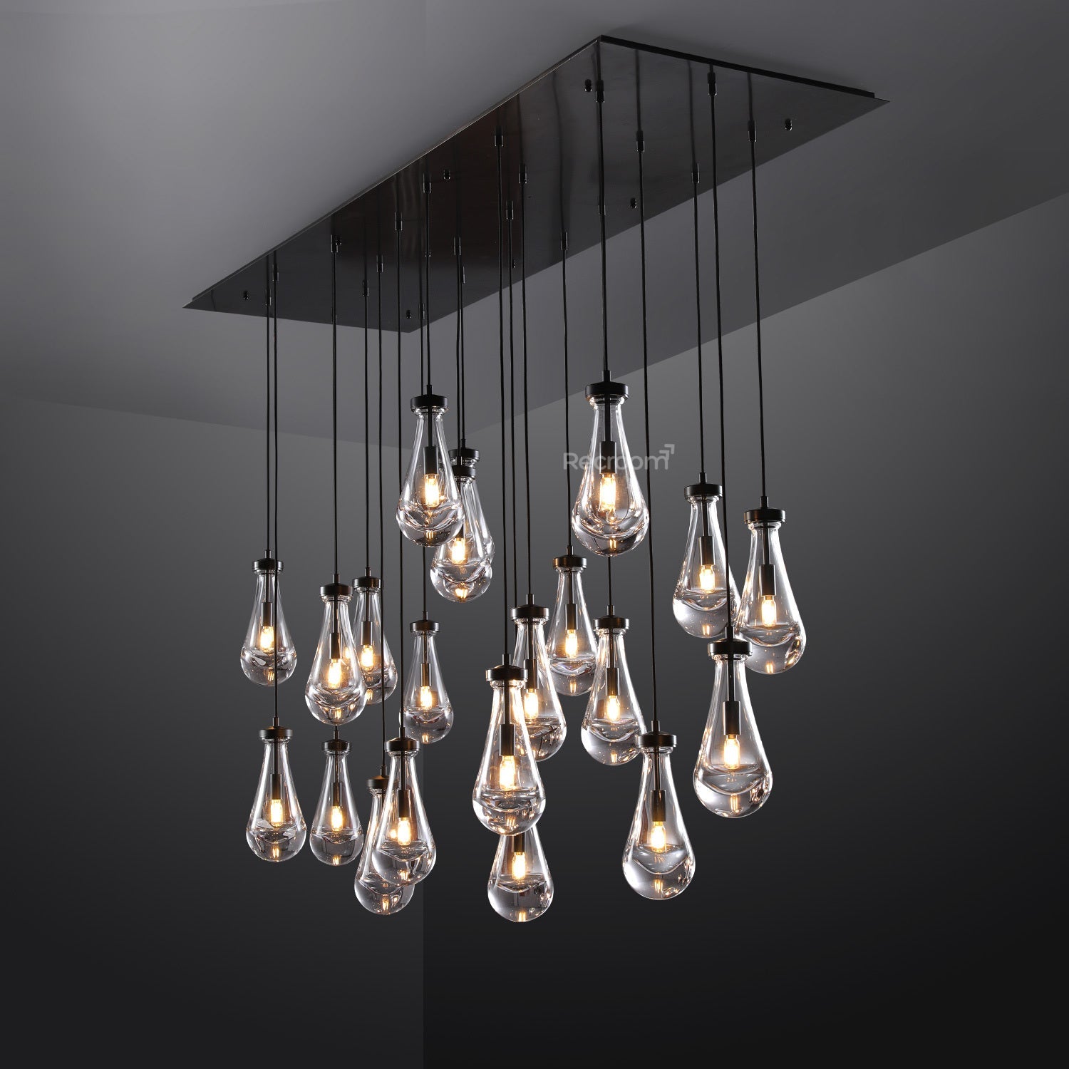 Recroomzone created a dramatic evocation of rain in this inspired collection. Suspended from slim black cords, drops of blown glass encase the bulb, casting luminous ripples that wash across ceilings and walls.