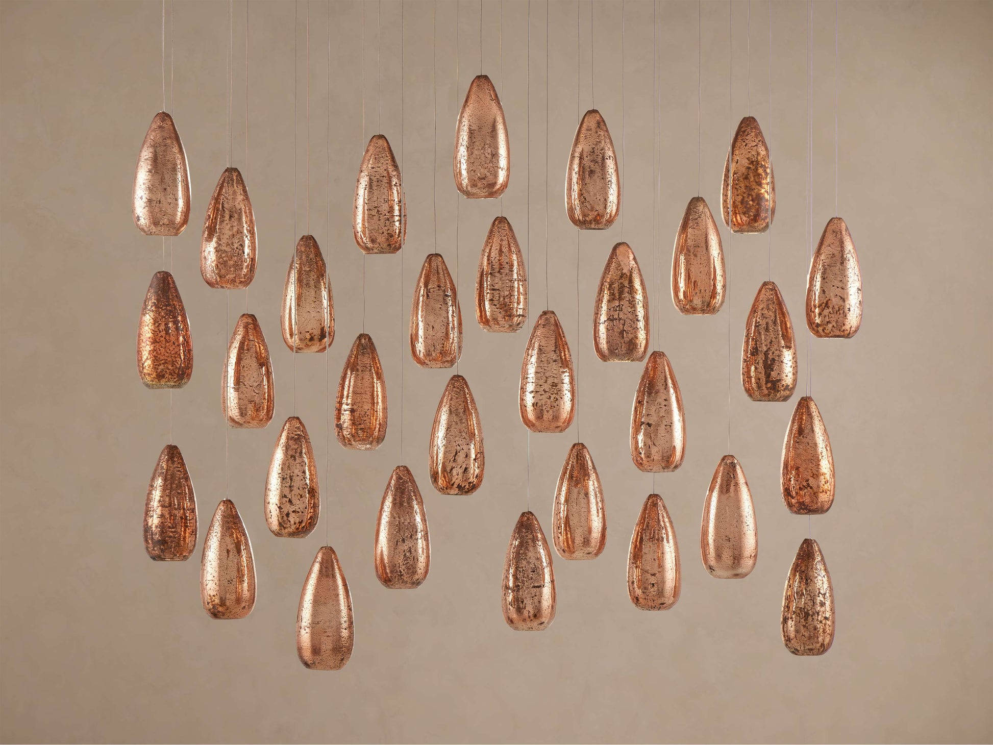 - Crafted from wrought iron and glass. Teardrop mercury glass shades showcase a warm copper exterior with a silver-finished interior.