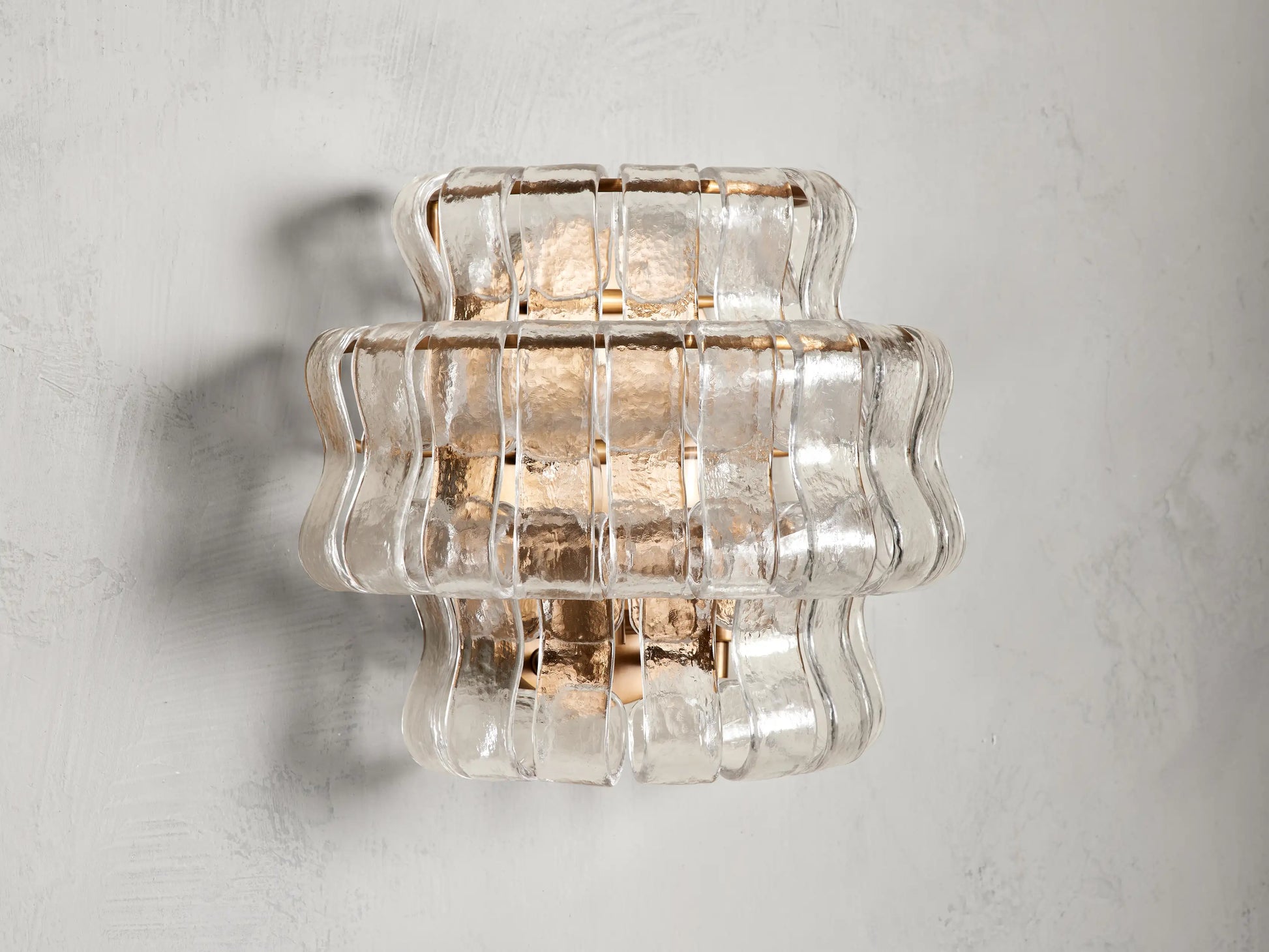 Inspired by famous Italian decorative glass, our Ghiaccio lighting range subtly diffuses light through curved textured glass. Ghiaccio features a brass plated finish that elegantly brightens any room.